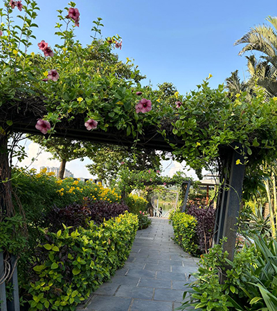 Garden development activity focuses on hardscape work ie. civil work like water bodies, pergolas, pathways, fountains,electrification, and softscape work such as plantation, lawns, vertical gardens, topiery, hedges/ edges, flower beds, wind breaks, friut trees, terrace or on roof plantation.